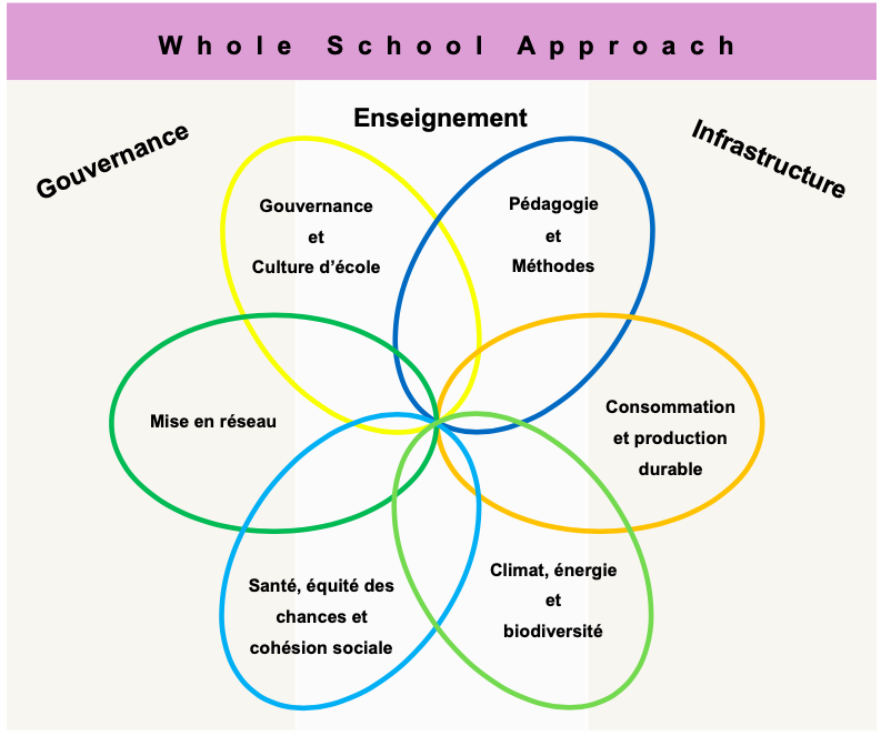 L’enseignement et le campus scolaire forment une symbiose : les connaissances acquises permettent de rendre le site et les pratiques scolaires plus durables, et des espaces pensés dans une optique de durabilité deviennent des supports d’apprentissage.